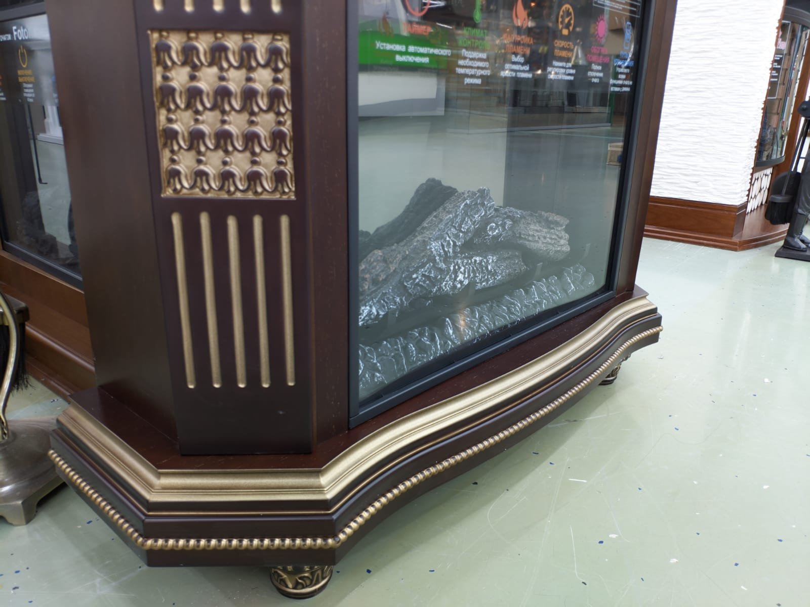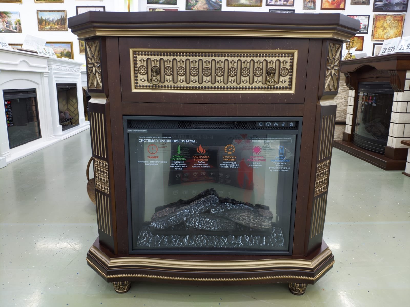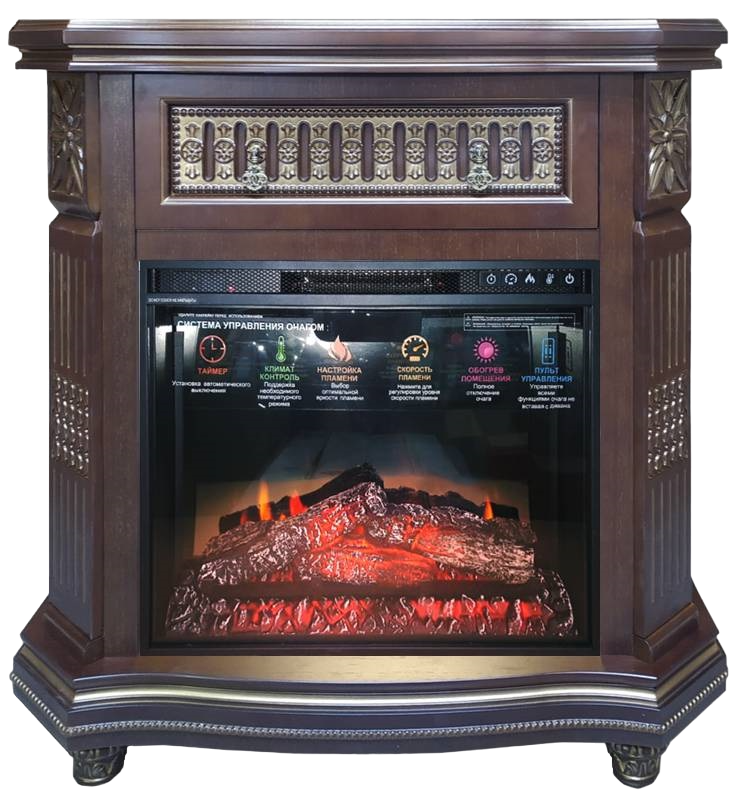 Очень красивое, яркое, вьющееся пламя. Дрова, расположенные за плоским стеклом, сделаны с максимальной схожестью с настоящими обугленными поленьями. Даже выключенный очаг смотрится как настоящий погасший камин. Яркость пламени регулируется. Скорость движения языков пламени регулируется. Действительно реалистичный звук потрескивания горящих поленьев. Новый кварцевый обогреватель с функцией «климат-контроль» с цифровым дисплеем обеспечивает быстрый обогрев в холодную погоду, а что самое главное – не сжигает кислород в помещении! Есть таймер на отключение. Все функции можно настроить по своему желанию не вставая с дивана с помощью пульта ДУ