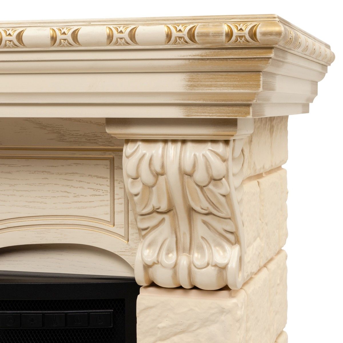 Электрический камин Bolero. Эффектное, и в тоже время не перегруженное деталями, обрамление в цвете дуб белый с золотой патиной, с очагом Firefield 25 SIR.