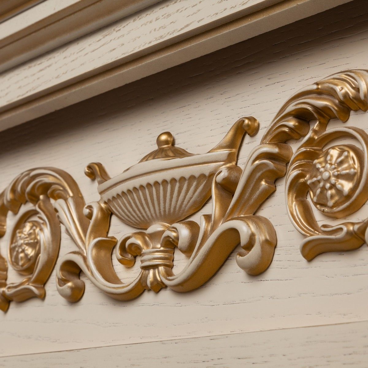 Выполнен в классическом стиле, изготовлен из высококачественного шпонированного МДФ в цвете беленый дуб WT-659 (с золотой патиной)