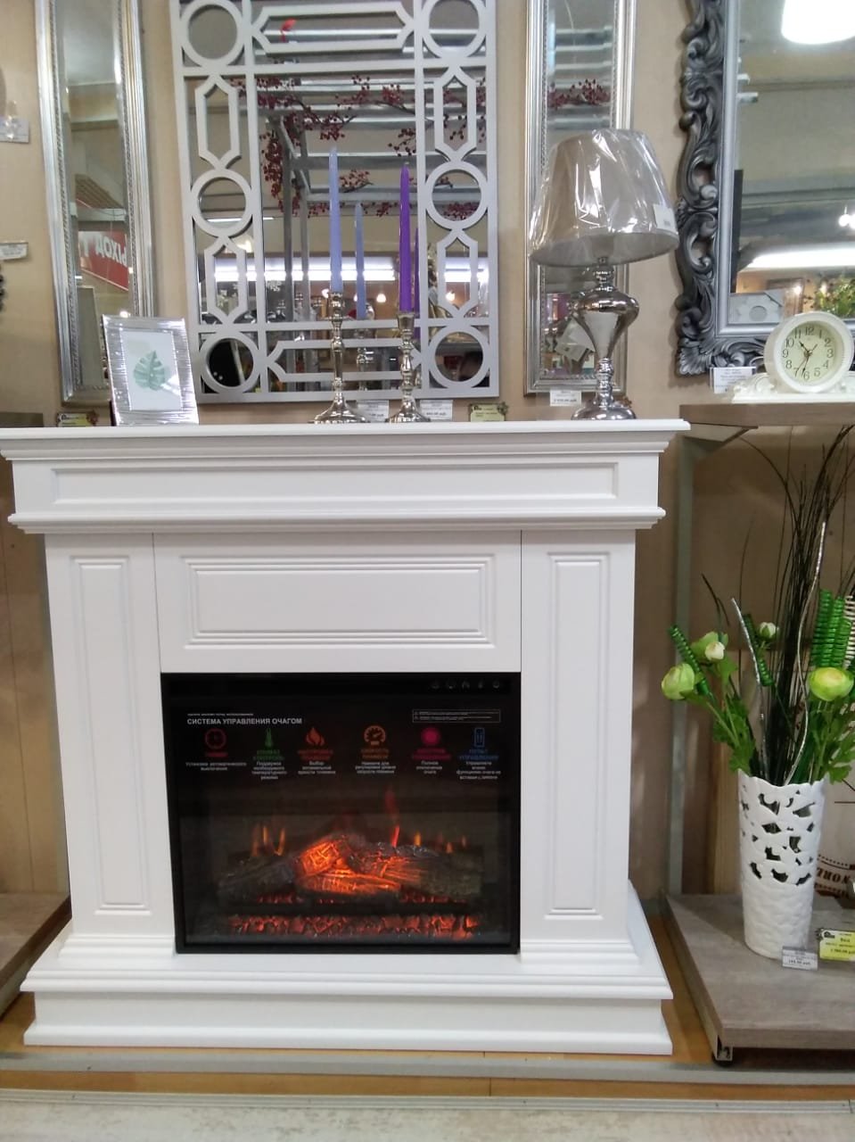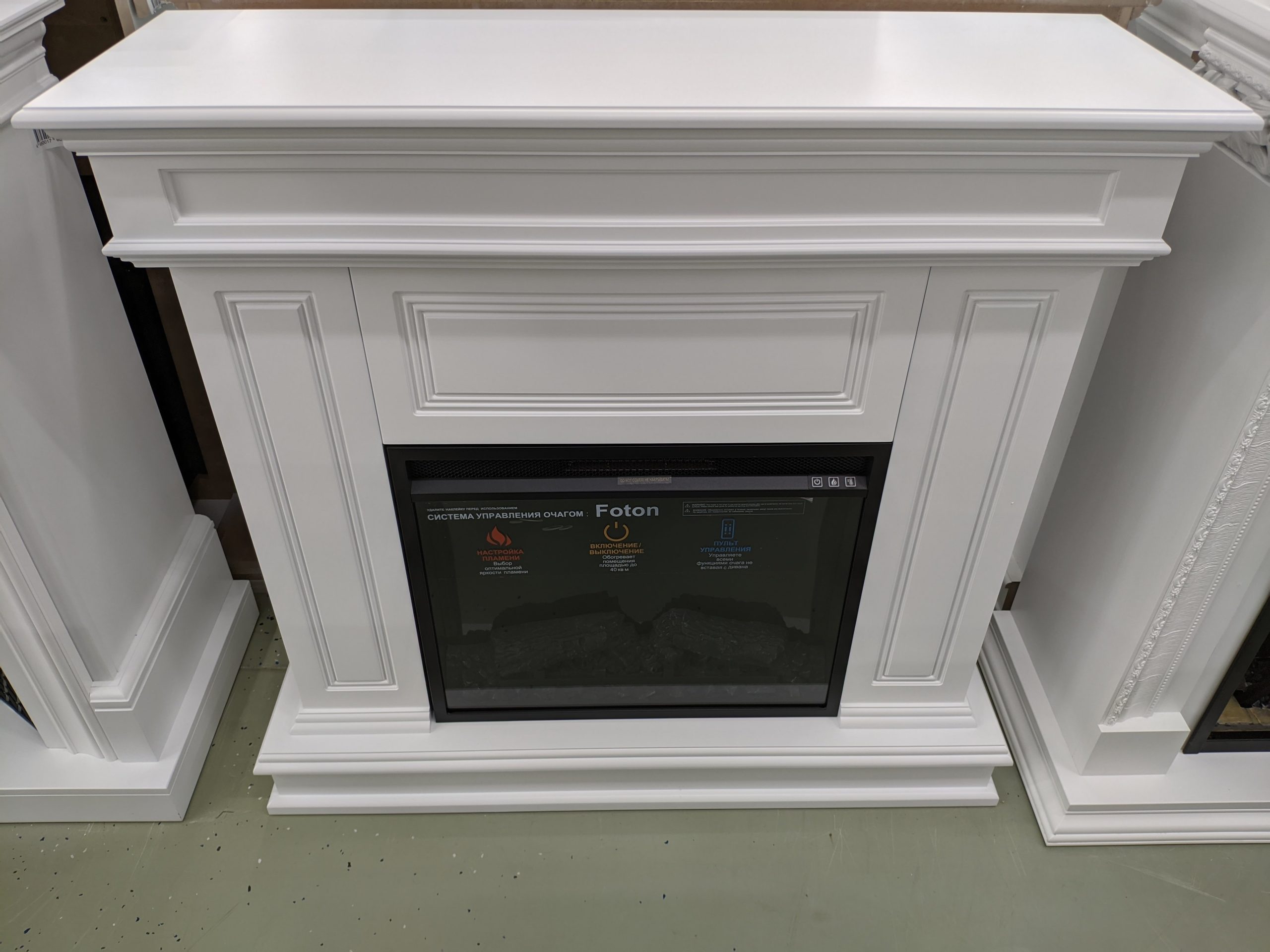 Очень красивое, яркое, вьющееся пламя. Дрова, расположенные за плоским стеклом, сделаны с максимальной схожестью с настоящими обугленными поленьями. Даже выключенный очаг смотрится как настоящий погасший камин. Яркость пламени регулируется. Скорость движения языков пламени регулируется. Действительно реалистичный звук потрескивания горящих поленьев. Новый кварцевый обогреватель с функцией «климат-контроль» с цифровым дисплеем обеспечивает быстрый обогрев в холодную погоду, а что самое главное – не сжигает кислород в помещении! Есть таймер на отключение. Все функции можно настроить по своему желанию не вставая с дивана с помощью пульта ДУ