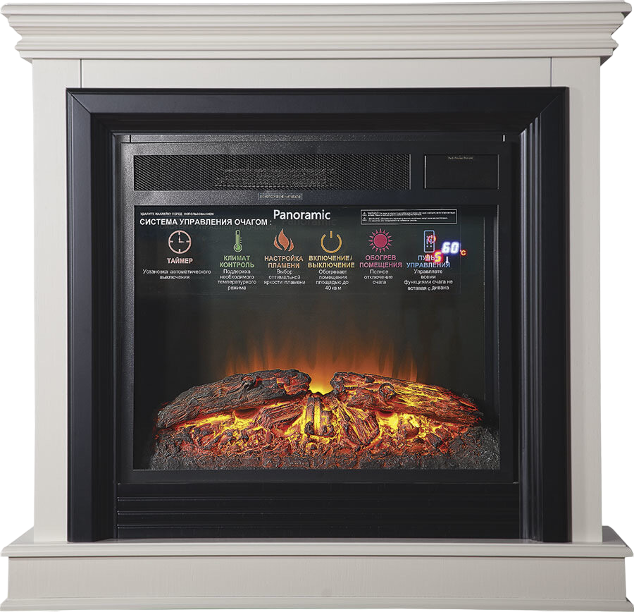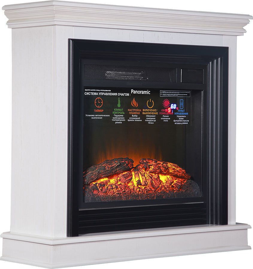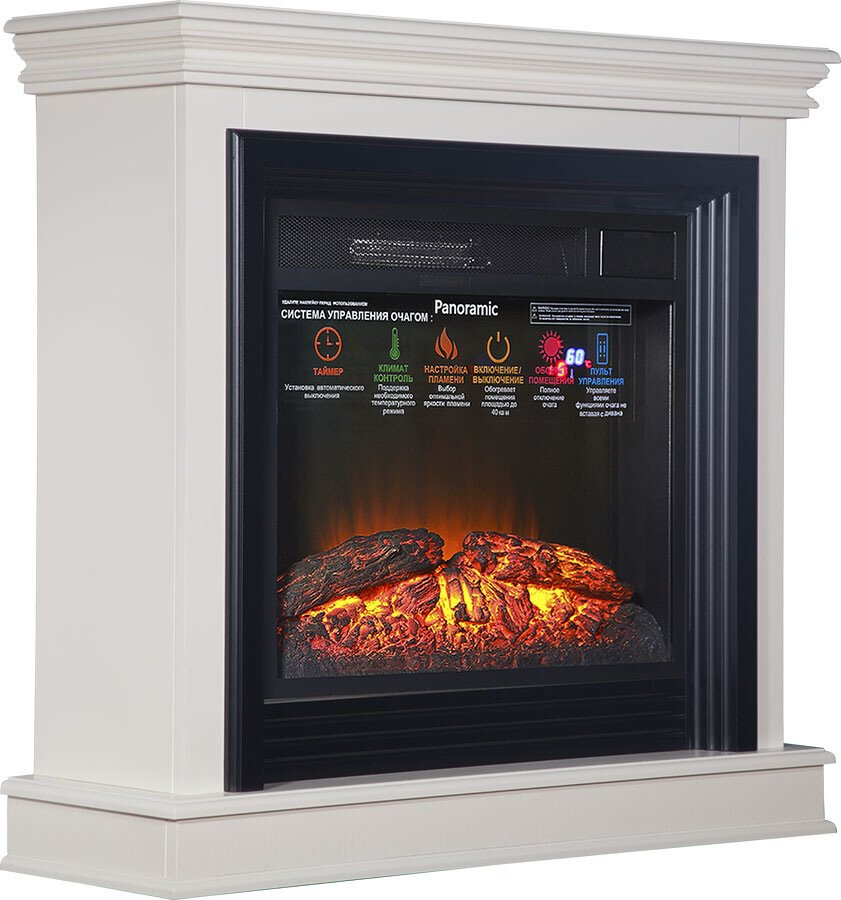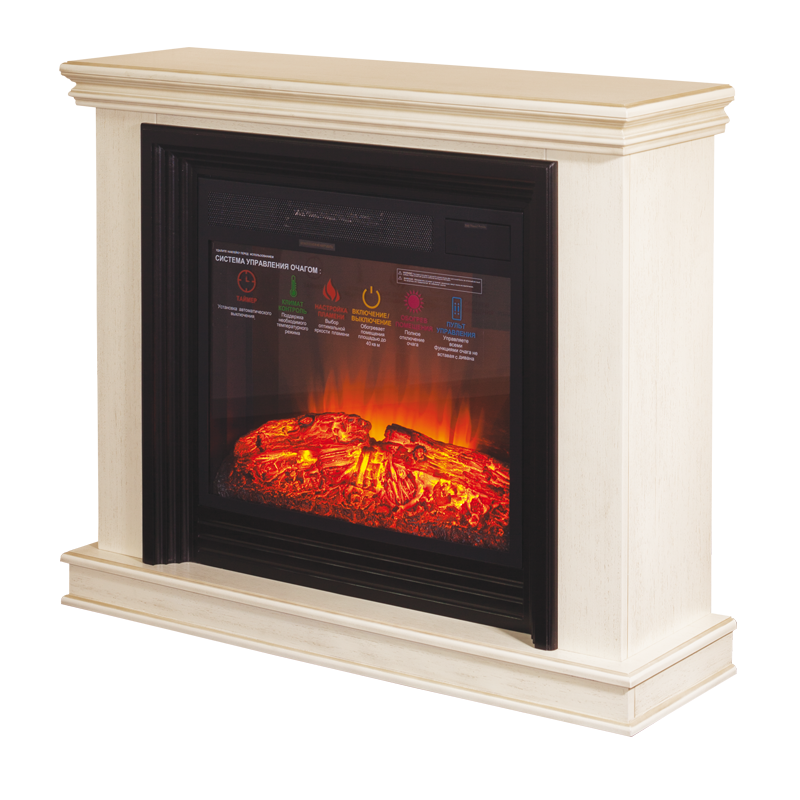 Очень красивое, яркое, вьющееся пламя. Дрова, расположенные за плоским стеклом, сделаны с максимальной схожестью с настоящими обугленными поленьями. Даже выключенный очаг смотрится как настоящий погасший камин. Яркость пламени регулируется. Скорость движения языков пламени регулируется. Действительно реалистичный звук потрескивания горящих поленьев. Новый кварцевый обогреватель с функцией «климат-контроль» с цифровым дисплеем обеспечивает быстрый обогрев в холодную погоду, а что самое главное – не сжигает кислород в помещении! Есть таймер на отключение. Все функции можно настроить по своему желанию не вставая с дивана с помощью пульта ДУ