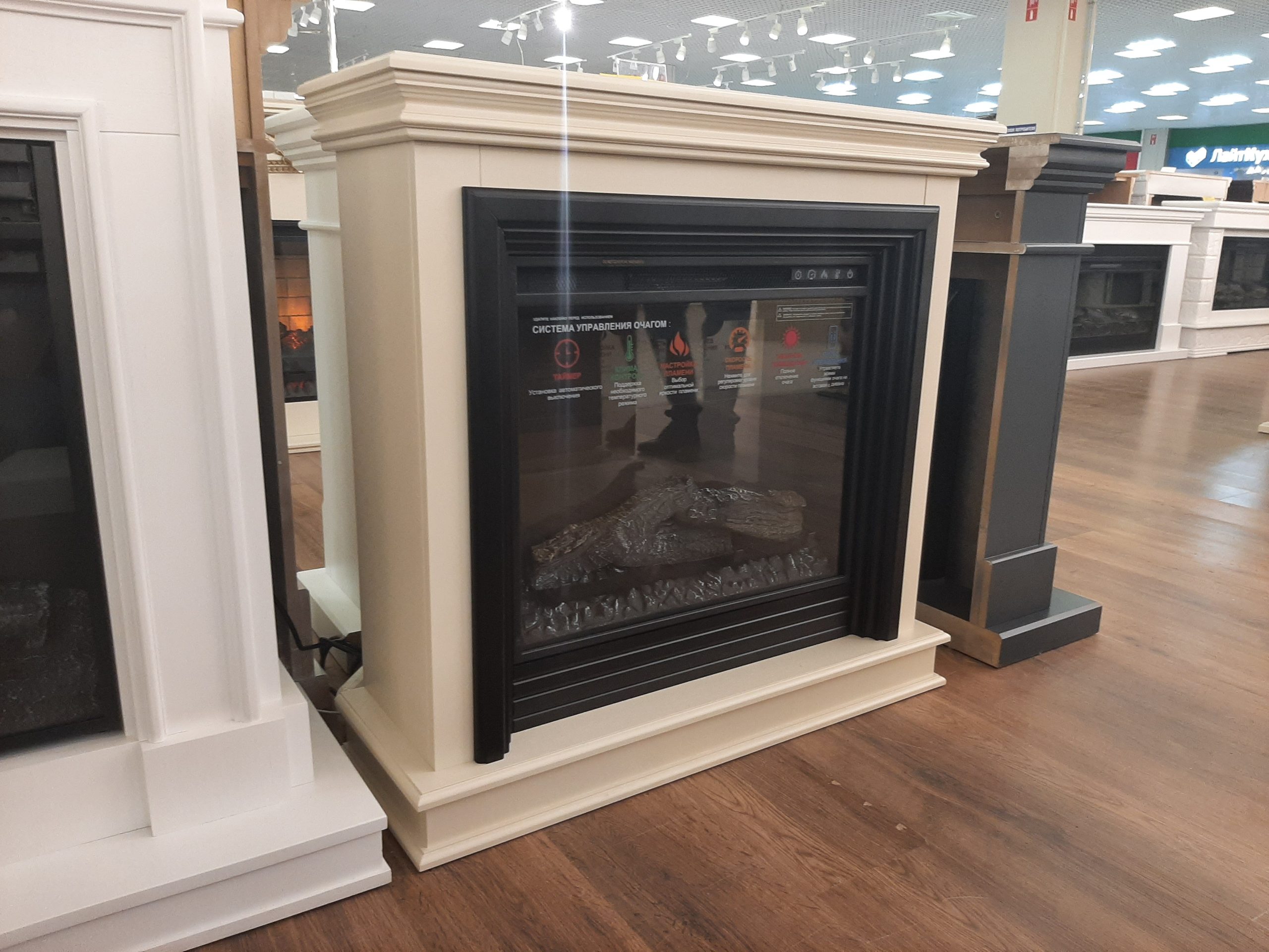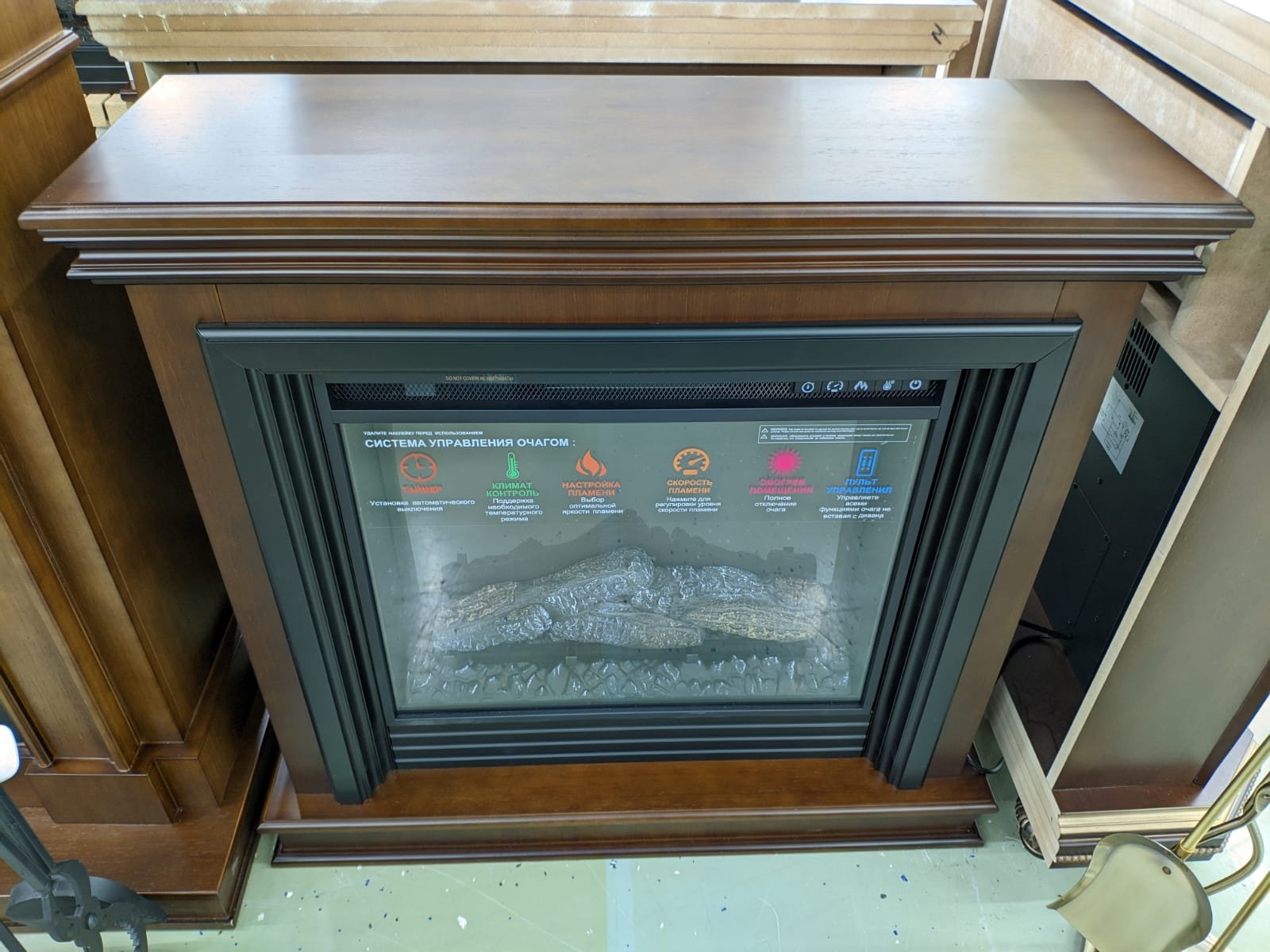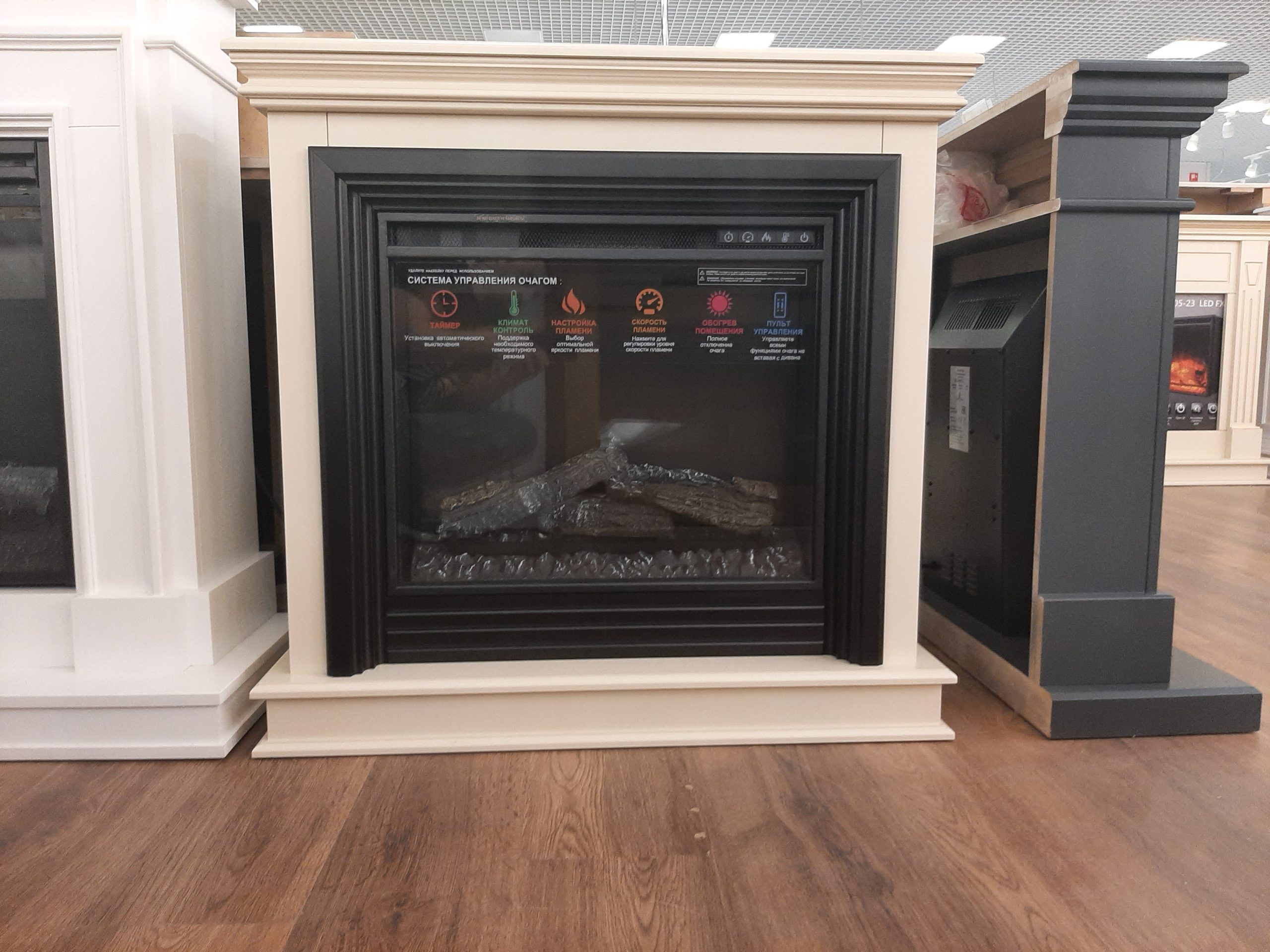 Очень красивое, яркое, вьющееся пламя. Дрова, расположенные за плоским стеклом, сделаны с максимальной схожестью с настоящими обугленными поленьями. Даже выключенный очаг смотрится как настоящий погасший камин. Яркость пламени регулируется. Скорость движения языков пламени регулируется. Действительно реалистичный звук потрескивания горящих поленьев. Новый кварцевый обогреватель с функцией «климат-контроль» с цифровым дисплеем обеспечивает быстрый обогрев в холодную погоду, а что самое главное – не сжигает кислород в помещении! Есть таймер на отключение. Все функции можно настроить по своему желанию не вставая с дивана с помощью пульта ДУ